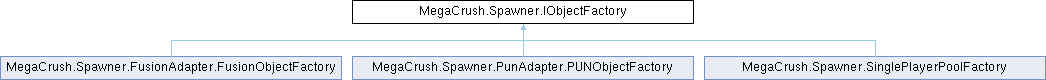 Implemented in MegaCrush.Spawner.FusionAdapter.FusionObjectFactory, MegaCrush.Spawner.PunAdapter.PUNObjectFactory, and MegaCrush.Spawner.SinglePlayerPoolFactory.